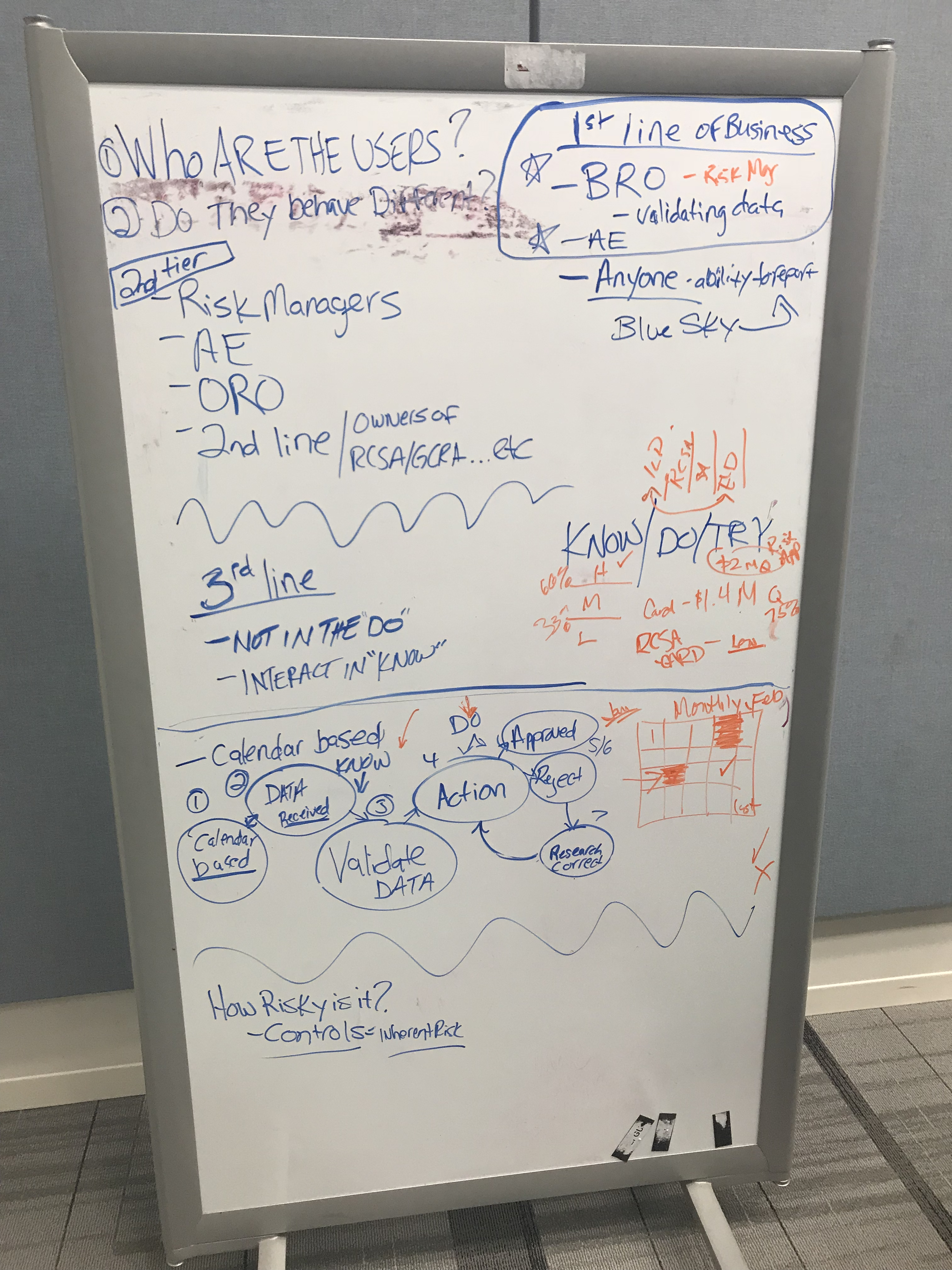 "Imagine a world where..." the most consistent phrase we heard. My team and I conducted over 13 different road shows and design sessions with several lines of business in the organizational risk department. Our goals were to effectively hone in on the needs of our users in order to accurately define our problem statements. As humans and great problem solvers our stakeholders were excited to begin solutioning..and as a student of humankind, I myself love finding the undiscovered pain point. We derived that better understanding of risk mitigation, taking action in mitigating risk and innovative preventative measures.